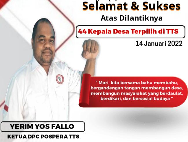 DETIKDATA, SOE – Yerim Yos Fallo selaku Ketua Dewan Pimpinan Cabang (DPC) Posko Perjuangan Rakyat (Pospera) Kabupaten Timor Tengah Selatan (TTS), Nusa Tenggara Timur (NTT) menyampaikan selamat dan sukses kepada 44 kepala desa terpilih yang resmi dilantik oleh Bupati TTS, Egusem Pieter Tahun di Taman Rekreasi Bu’at Soe, Jumat, 14 Januari 2022.