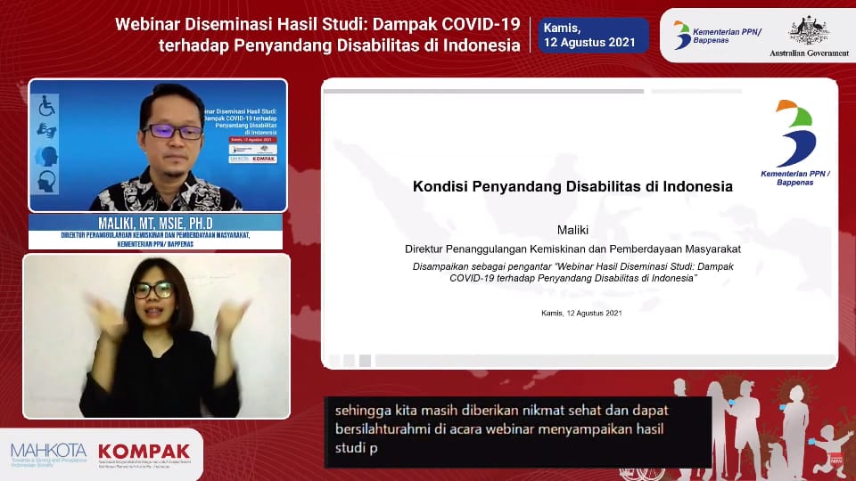 Sebagai salah satu acuan reformasi perlinsos untuk penyandang disabilitas, Kementerian PPN/Bappenas didukung Kolaborasi Masyarakat dan Pelayanan untuk Kesejahteraan atau KOMPAK, Menuju Masyarakat Indonesia yang Kuat dan Sejahtera atau MAHKOTA, dan Jaringan Organisasi Penyandang Disabilitas merampungkan studi inklusif terkait COVID-19 yang menyasar penyandang disabilitas.