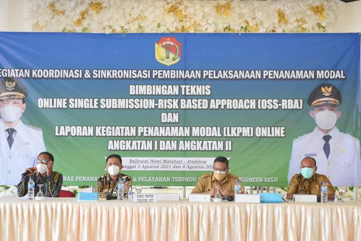 DETIKDATA, ATAMBUA – Dinas Penanaman Modal dan Pelayanan Terpadu Satu Pintu Kabupaten Belu melalui Bidang Pengendalian Pelaksanaan dan Pengolahan Data dan Informasi Penanaman Modal menggelar Bimbingan Teknis (Bimtek) Online Single Submission-Risk Based Approach (OSS-RBA) dan Laporan Kegiatan Penanaman Modal (LKPM) Online Angkatan I dan Angkatan II, berlangsung di Ballroom Hotel Matahari Atambua. Selasa (03/08/21).