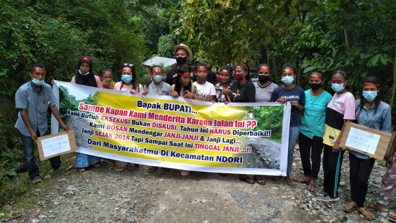 Warga menghalangi perjalanan bupati dengan membentangkan spanduk bertuliskan “Bapak Bupati sampai kapan kami menderita dengan jalan ini? Kami butuh eksekusi bukan diskusi, tahun harus di perbaiki!!! Kami bosan dengan janji-janji dan janji lagi…janji sejak dari tahun 2016 sampai saat ini Tinggal Janji..!!! Dari Masyarakat mu di kecamatan Ndori..” Tak hanya membentangkan sepanduk tetapi masyarakat juga menanam pohon pisang di ruas jalan tersebut.