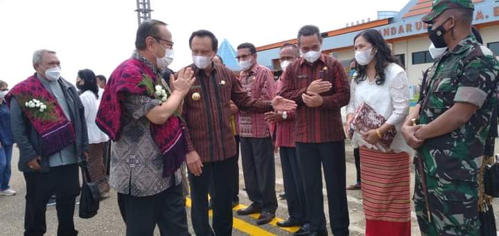 DETIKDATA, ATAMBUA – Bupati Belu dr. Taolin Agustinus, Sp.PD-KGEH, FINASIM dan Wakil Bupati Belu Drs. Aloysius Haleserens, MM, didampingi Ibu Ketua dan Wakil Ketua Tim Penggerak PKK Kab. Belu menyambut kunjungan Kardinal Prof. Dr. Ignatius Suharyo, Pr dan rombongan dengan pengalungan selendang di Bandar Udara A. A. Bere Tallo, Atambua. Jumat (03/12).
