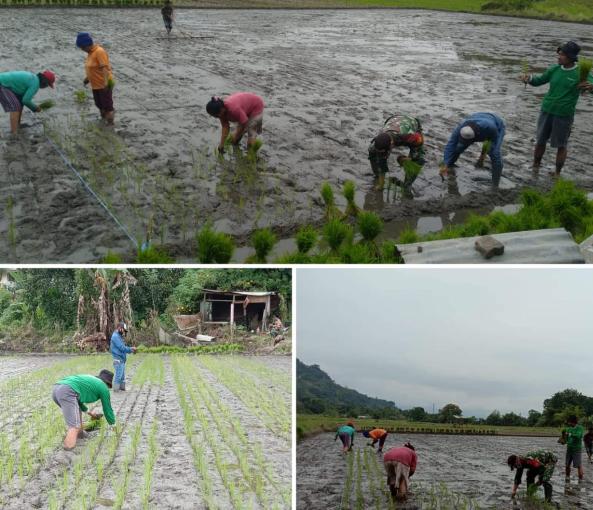 Serda Fredy Sianturi dan perwakilan Kelompok Tani Koptas Jaya, Lamindo Sirait, Herlina Manik, Risma Tumanggor turun langsung dalam uji coba pertanaman sistem Banjar Legowo Salibu ini, Senin (18/01/2021).
