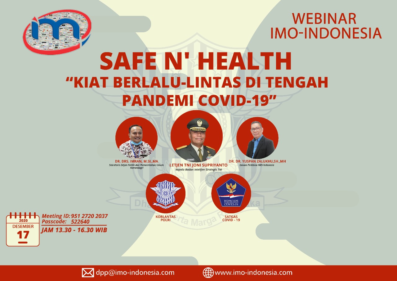 Webinar dengan tema SAFE N’ HEALTH, Kiat Berlalu Lintas Di masa Pandemi COVID-19 menjadi sebuah tema yang cukup menarik untuk dapat mengedukasi publik secara lebih luas karenanya berlalu lintas menjadi suatu kebutuhan seluruh masyarakat dalam menjalankan berbagai aktifitas, ujar yakub ismail ketua umum IMO-Indonesia, jumat 18/12 siang di Jakarta.
