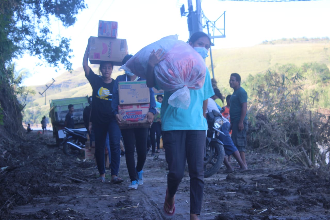 DETIKDATA, WAINGAPU – Jalan kaki sejauh enam kilometer dan dua kali langgar sungai, Relawan Bencana Seroja dari Unkriswina Sumba dan R-Kompas mengantarkan donasi ke Dusun Laihing, Desa Kiritana, Kabupaten Sumba Timur, NTT. Sabtu (17/04/21).