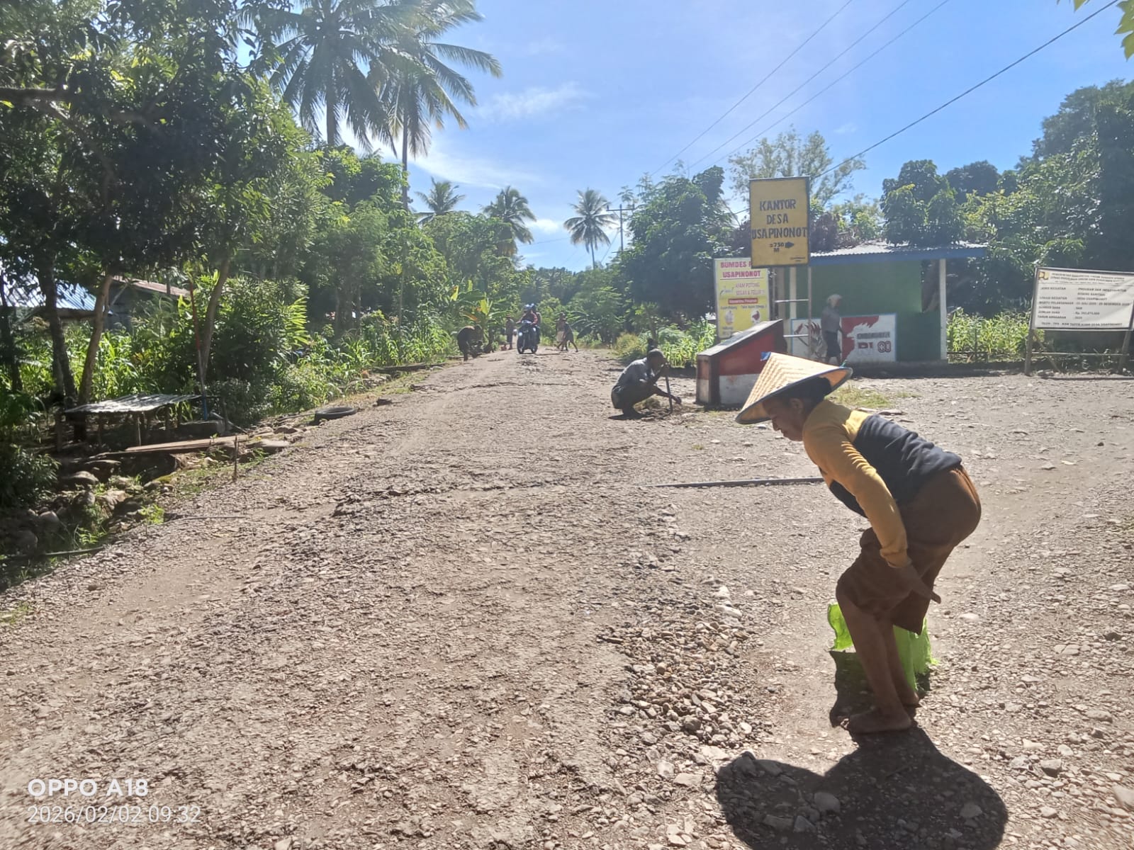 Warga Desa Usapinonot saat menambal lubang jalan. Senin, 02/02/2026