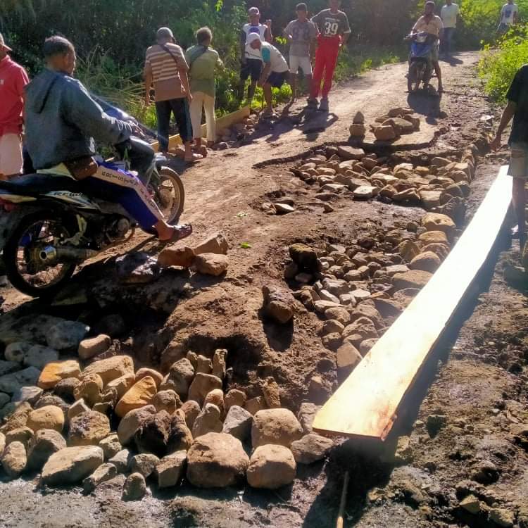 “Jalan ini sudah sangat ekstrim untuk dilalui kendaraan roda dua maupun roda empat sehingga masyarakat bahu membahu bekerja agar titik – titik berat bisa dilalui kendaraan,” ujar Pedro.