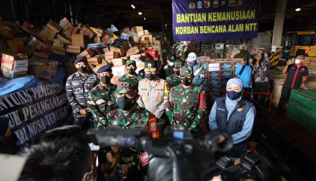 “Bantuan sebanyak 30 truk ini akan dikirim dan disalurkan ke NTT, Bansos terdiri dari berbagai macam kebutuhan hidup sehari hari seperti beras, mie instan, air mineral kemasan, pakaian layak pakai, makanan bayi, tenda, selimut, alat mandi, perlengkapan ibadah, obat-obatan, masker,“ ujar Laksda Sudihartawan.