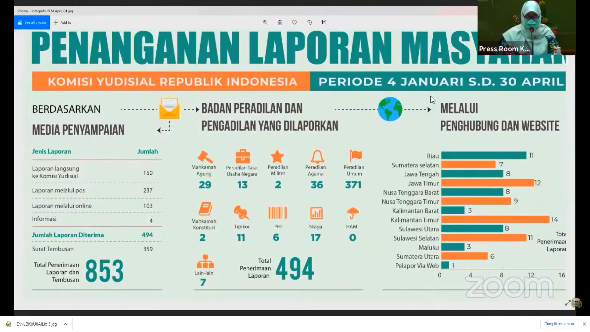 “Pada periode 4 Januari-30 April 2021, KY telah menerima laporan sebanyak 853 yang terdiri dari 494 laporan dan 359 tembusan yang berkaitan dengan pengawasan lembaga peradilan,” ujar Ketua Bidang Pengawasan Hakim dan Investigasi, KY, Sukma Violetta, dalam Konferensi Pers virtual Penanganan Laporan Masyarakat, di Ruang Press Room KY, Jakarta, Senin (3/5/2021).