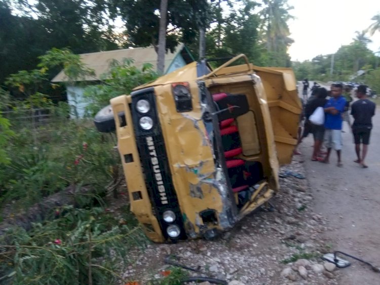 Laka lantas tunggal yang terjadi akibat kelalaian sopir dump truck, yang sedang mabuk sehingga tidak mampu mengendalikan mobil dan keluar jalur melewati tepi lunak dan mengakibatkan roda kiri depan mobil terlepas serta jatuh terjungkir di sisi kiri jalan aspal trans Ayotupas- Oeekam,” jelas Krisna.