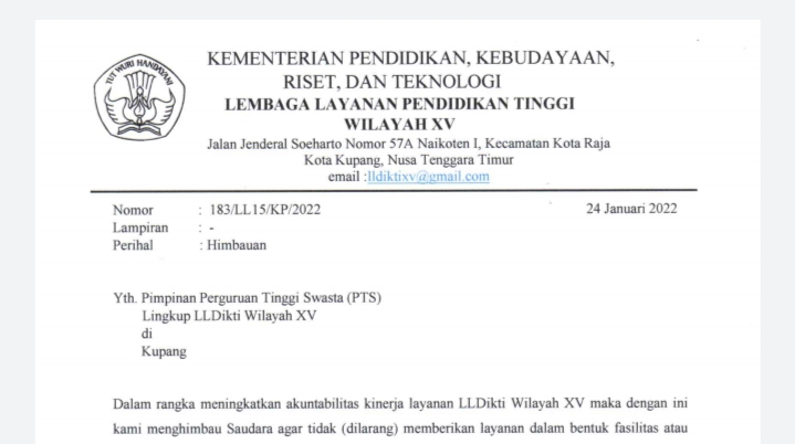 Surat resmi bernomor 183/1L15 KP/2022 tersebut dikeluarkan (24/01/22), ditujukan kepada Pimpinan Perguruan Tinggi Swasta (PTS). (DD/YW)