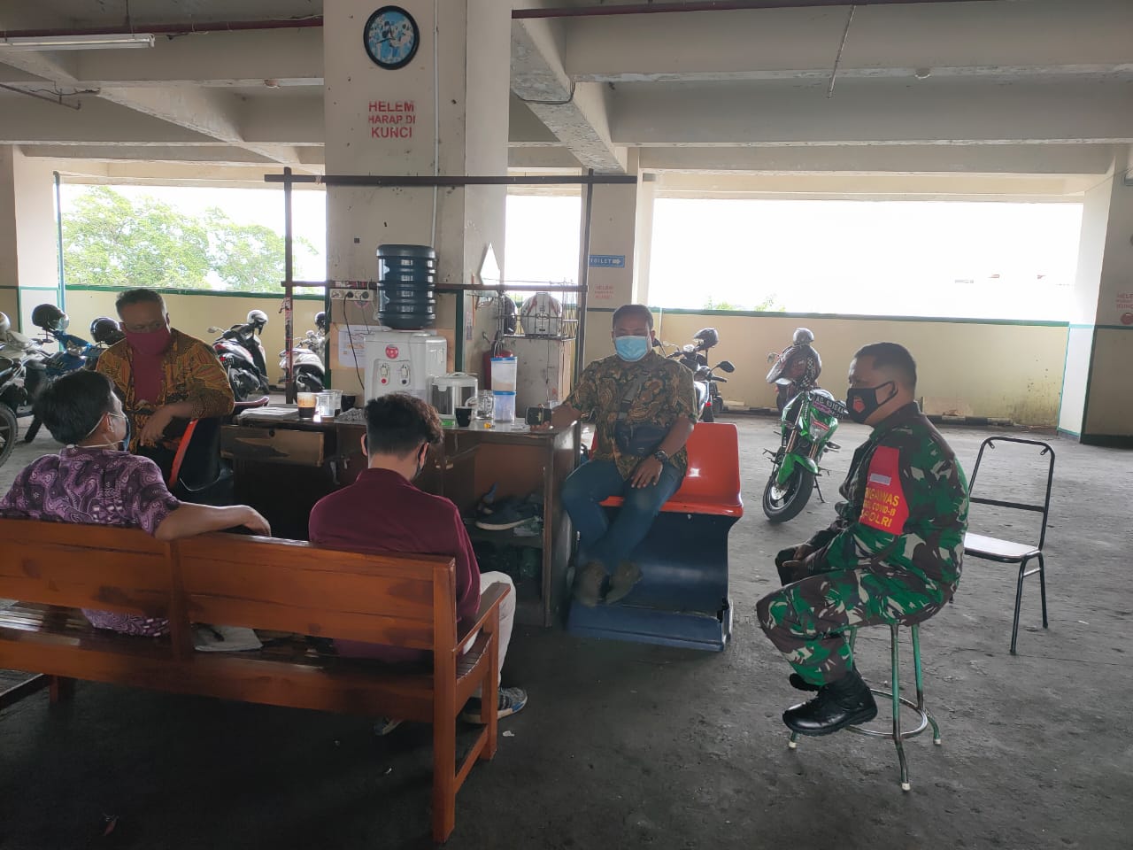 Babinsa Kelurahan Kemlayan Koramil 03 Serengan Kodim 0735 Surakarta Koptu Catur handoko melaksanakan pengecekan dan penerapan edukasi Pemberlakuan Pembatasan Kegiatan Masyarakat (PPKM) dengan Satpam dan penjaga parkir di Matahari Singosaren Plaza, (18/01/2021).