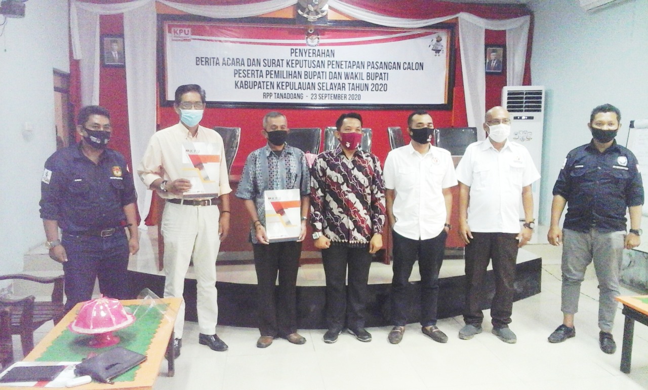 Usai menyampaikan pengantar, Ketua KPU Selayar, Nandar Jamaluddin bersama tiga orang komisioner yang terdiri dari koordinator divisi data, Sukardi, koordinator divisi sosialisasi, SDM dan partisipasi pemilih, Andi Nastuti dan koordinator divisi hukum, Mansurt Sihadji, berkenan melakukan penyerahan berita acara dan surat keputusan penetapan pasangan calon bupati dan wakil bupati tahun 2020 kepada lo penghubung pasangan calon dan pimpinan badan pengawas pemilu (Bawaslu) Kabpaten Selayar.