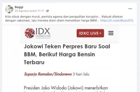 DETIKDATA, JAKARTA – Beredar sebuah unggahan pada platform Facebook, unggahan tersebut menampilkan potongan artikel dengan judul “Jokowi Teken Perpres Baru Soal BBM, Cek Harga Bensin Terbaru”. Disertai narasi yang mengeklaim bahwa Pemerintah secara diam-diam menaikkan harga BBM pada 23 Agustus 2021 kemarin.