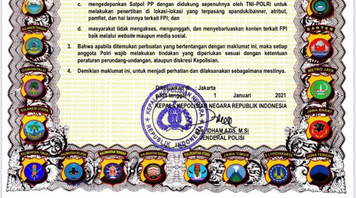 DETIKDATA, JAKARTA – Kepala Kepolisian Negara Republik Indonesia mengeluarkan maklumat Nomor: Mak/1/I/2021 tentang Kepatuhan terhadap Larangan Kegiatan, Penggunaan Simbol dan Atribut Serta Penghentian Kegiatan Front Pembela Islam (FPI), yang ditandatangani 1 Januari 2021. Polri beralasan, maklumat ini untuk memberikan perlindungan dan menjamin keamanan serta keselamatan masyarakat pasca dikeluarkan keputusan bersama tentang larangan kegiatan, penggunaan simbol dan atribut serta penghentian kegiatan FPI.