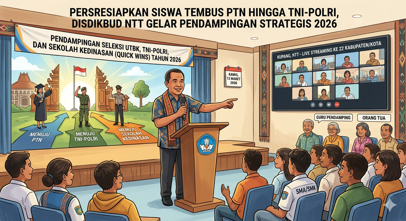 DETIKDATA.COM, KUPANG – Dinas Pendidikan dan Kebudayaan (Disdikbud) Provinsi Nusa Tenggara Timur (NTT) resmi memulai kegiatan Pendampingan Seleksi UTBK, TNI-Polri, dan Sekolah Kedinasan (Quick Wins) Tahun 2026. Kegiatan ini dibuka secara resmi di Aula SMK Negeri 2 Kota Kupang, Kamis (12/3/2026).