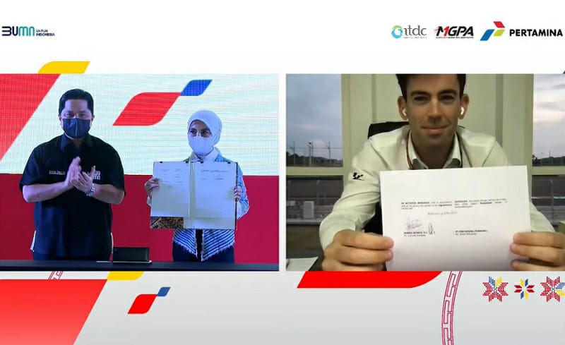 Penandatanganan dilakukan secara langsung oleh Direktur Utama Pertamina, Nicke Widyawati, dan Managing Director Dorna Sports, S.L Carlos Ezpeleta (secara daring) dan disaksikan oleh Menteri BUMN di Jakarta.