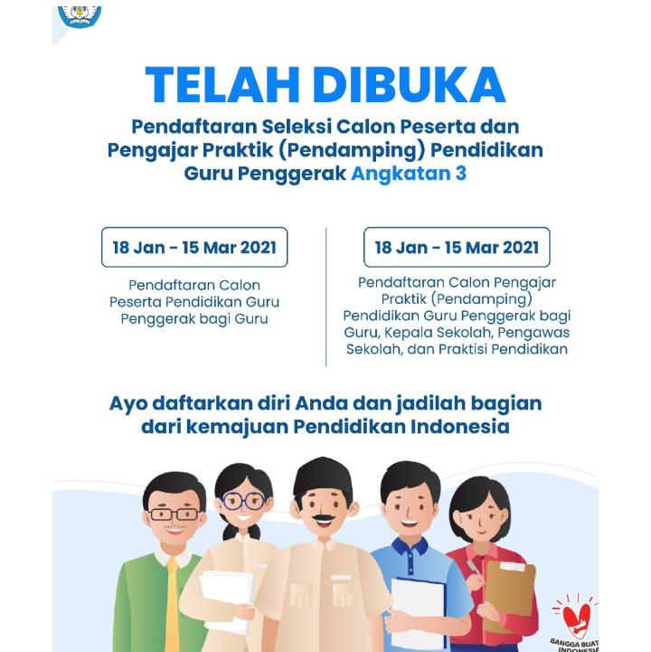 DETIKDATA, JAKARTA – Kementerian Pendidikan dan Kebudayaan (Kemendikbud) melalui Direktorat Jenderal Guru dan Tenaga Kependidikan kembali membuka pendaftaran seleksi Guru Penggerak. Seleksi untuk mengikuti Pendidikan Guru Penggerak (PGP) angkatan ketiga ini akan dilakukan mulai tanggal 18 Januari 2021. Seleksi terbuka untuk guru jenjang TK, SD, SMP dan SMA.