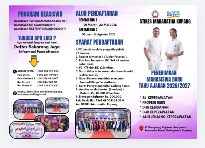 DETIKDATA.COM, KUPANG – Sekolah Tinggi Ilmu Kesehatan (STIKES) Maranatha Kupang resmi mengumumkan pembukaan penerimaan mahasiswa baru untuk Tahun Ajaran 2026/2027. Institusi kesehatan yang berlokasi di Jalan Kampung Bajawa, Nasipanaf ini menawarkan berbagai program studi unggulan bagi calon mahasiswa yang ingin berkarier di dunia kesehatan.