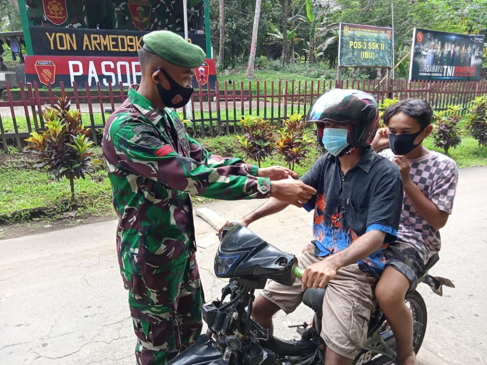 Satgas Yonarmed 9 Lakukan Penertiban Penggunaan Masker di Desa Kampung Baru